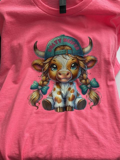 Gildan - XL Adult Short Sleeve T-Shirt - Salty Heifer cow on Safety Pink